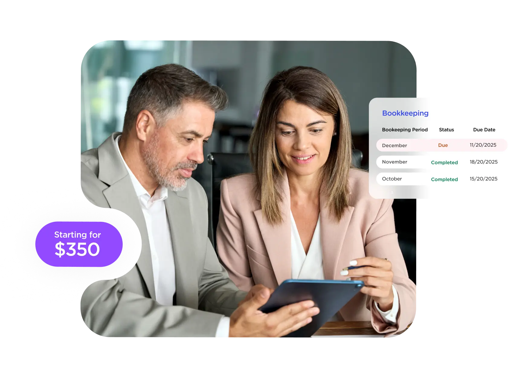 Expert monthly bookkeeping. sales tax and payroll paired with year-round tax planning and filing, everything your business needs in one place. Pricing starts from just $350/month.